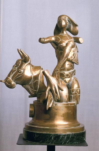 - NOTIZIE STORICO CRITICHE Questa scultura è stata più volte pubblicata nei volumi dedicati al lavoro di Bodini.\nLa prima riproduzione dell'opera appare, un anno dopo la sua esecuzione, sul catalogo di una mostra dello scultore tenutasi nel 1976 a Torino (Bodini, 1976). Il catalogo pubblica tra l'altro una presentazione del lavoro di Bodini scritta da Lajolo già l'anno prima per una precedente esposizione dell'artista: si tratta del primo testo dedicato dallo scrittore all'amico (Lajolo, 1975).\nE' molto probabile che fu in occasione di una delle due mostre che Lajolo ricevette in dono dallo scultore il gesso da cui fu tratta la "Ragazza e toro": infatti Angela Candiani ha raccontato di essere stata lei a far realizzare la fusione in bronzo della scultura dal gesso regalatole da Lajolo, il quale a sua volta lo aveva ricevuto in dono direttamente dall'artista (2000, comunicazione orale). \nE' stata proprio la Candiani infatti ad acquistare la maggior parte delle sculture di Bodini presenti nella collezione, soprattutto nel periodo successivo alla morte del marito (1984).\nLa sua testimonianza appare confermata da una dedica scritta da Bodini sulla copia del catalogo di una mostra del 1982, conservata dalla Fondazione Lajolo, in cui è pubblicata la scultura in questione. Sulla pagina in cui compare la sua riproduzione fotografica (p. nn., 11) Bodini ha scritto: "a Angela con tanta vera amicizia/ Floriano/ W all'8 gennaio" (Vespignani, 1982). L'otto gennaio era la data del compleanno della Candiani, che cadeva lo stesso giorno in cui Bodini festeggiava il suo, fatto che entrambi ricordavano volentieri, come dimostrano dediche e testimonianze verbali. Un'altra pagina dello stesso catalogo (p. nn., 13), in cui un'altra scultura della collezione ("Paola", 1967) è anch'essa accompagnata da una dedica dell'artista, riporta anche l'anno: 1986. \nE' evidentemente che al momento dell'acquisto delle due sculture Bodini ha voluto ricordare il fatto con una dedica all'amica-collezionista, scritta ciascuna sulla pagina in cui l'opera in questione era stata riprodotta su un catalogo che le aveva pubblicate entrambe. \nSi segnala però che la "Ragazza e toro" pubblicata in questo catalogo è in argento, mentre la copia della collezione Lajolo (C. 1/3) è in bronzo. Le misure riportate nella dascalia, leggermente diverse (49x28x26), sono quelle della sola parte in bronzo, mentre l'esemplare della collezione è saldato ad un basamento circolare di marmo che ne aumenta l'altezza.\nL'utilizzo della presenza di un animale per accentuare le caratteristiche proprie dei personaggi ritratti è abbastanza tipica nella produzione di Bodini di questi anni. \nL'esecuzione della scultura della collezione è vicina nel tempo a quella della famosa "Biografia inquieta di un personaggio femminile" (1976), in cui una scimmia compare tra i diversi elementi che costruiscono il ritratto psicologico di Wanda, moglie dell'artista. \nIl ricorso a questo espediente espressivo era già stato sperimentato nei numerosi lavori (sculture ma anche disegni) che hanno per soggetto la figlia Paola, raffigurata con i suoi cuccioli o animali giocattolo, o nella scultura intitolata "La madre", del 1973, in cui una figura di donna compare accanto ad una gallina, o, più tardi, in "Ragazza e cane" del 1983.\n"Animali che fanno corpo con l'uomo e con la figura" fa notare Lajolo, accostando il nome di Bodini a quello del poeta Umberto Saba del quale ricorda alcuni versi: "Guardo, donna, il tuo cane che, adorato, ti adora"; e le similitudini con la moglie: "La bianca pollastra", "La gravida giovenca", "Sei la pavida coniglia" (Lajolo, 1975). \nIl soggetto del toro è inoltre riconducibile a Picasso, al quale si avvicina anche il procedimento di scomposizione per volumi e la costruzione della figura femminile con braccia e mani separate dal corpo. Lo stile geometrizzante e stilizzato sembra inoltre denunciare un interesse per l'opera di De Chirico.