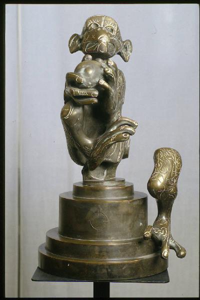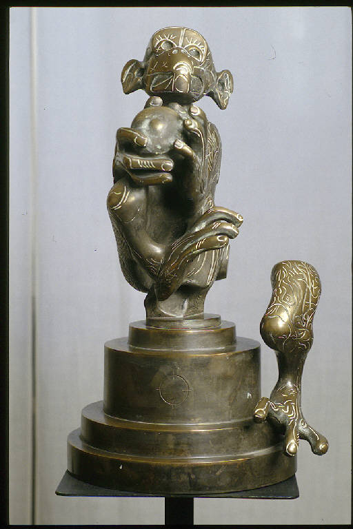 - NOTIZIE STORICO CRITICHE Il soggetto degli animali compare frequentemente sia nella scultura che nella grafica di Floriano Bodini. \nA questo proposito scrive Lajolo in una lettera che fa da presentazione a una mostra dell'amico nel 1975: "Nel tuo studio c'era Amedeo, il cane color moscato, che dormiva sulla poltrona dietro l'ampio tavolo ma ti guardava con i grandi occhi inteneriti (...). Per questo bestiario reale come Amedeo io ti ho chiesto entrando e vedendo tanti animali che fanno corpo con l'uomo e con la figura se eri un lettore di Umberto Saba. Mentre passavo davanti e toccavo le tue bestie mi erano venuti in mente i versi del poeta: (...) "In una capra dal viso semita - sentivo querelarsi ogni altro male - ogni altra vita"." (Lajolo, 1975).\nGiorgio Seveso commenta così gli animali realizzati dall'artista: "Sintesi inquieta, assorta, trepidante tra il regno della natura e quello della tecnologia nella meccanicità, appunto, delle più calde emozioni organiche, nella sanguigna, "razionale" animalità tecnomorfica del gesto figurale. Contrasto fecondo, intreccio mobile di mondi e visioni diverse che si saldano nella sonora consistenza del metallo e nell'incisa asciuttezza del disegno (...)" (Seveso,1979).\nIl brano è estratto dal testo critico di Seveso pubblicato sul catalogo della mostra "gli uomini / gli animali", tenutasi nel 1979 alla galleria Spazio Immagine di Milano, comprendente una decina di sculture, sei disegni e trenta lavori di grafica dedicati in buona parte al tema degli animali. \nTra le sculture esposte c'è anche una scultura intitolata "La scimmia", del 1977, eseguita quindi tre anni prima di questa della collezione Lajolo.\nLa collezione possiede anche un disegno di Bodini del 1976 che raffigura una scimmia con mela (NSK 51).\nSi potrebbe ipotizzare che il disegno sia uno studio per la scultura, se non fosse che l'artista stesso, intervistato nel 1976 da Anty Pansera per la rivista "Artecontro", afferma di non avere l'abitudine di realizzare studi per scultura e di considerare il disegno un mezzo espressivo indipendente (Bodini, 1976).\nUna versione di questa scultura della collezione, quasi identica e realizzata nello stesso anno (1979), è riprodotta sul catalogo di una mostra di Bodini del 1991: essa però è diversa nelle dimensioni e nei segni grafici incisi sulla superficie (Corradini, 1994).\nAnche questa scultura, come quasi tutte quelle di Bodini presenti nella collezione, è un acquisto di Angela Candiani, fatto nel periodo successivo alla morte del marito Davide Lajolo nel 1984 (2000, comunicazione orale).