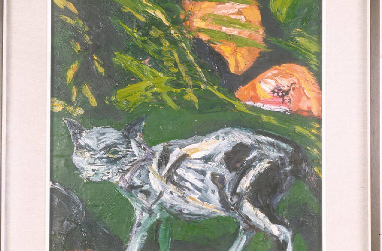 - NOTIZIE STORICO CRITICHE Tra i numerosi dipinti di Maffi presenti nella collezione Lajolo, due raffigurano un gatto (NSK 69, 70). In entrambi i casi, il soggetto è stato realizzato su precisa richiesta di Angela Candiani, la quale voleva ricordare in questo modo l'appellativo di "micio" con cui il compagno Davide Lajolo era solito chiamarla e si rivolgeva a lei nelle lettere che le scriveva (2000, Candiani Angela, com. or.).\nSecondo la testimonianza del pittore Ugo Maffi, il soggetto del gatto non è infatti consueto per lui, e i due dipinti della collezione Lajolo sarebbero gli unici realizzati con tale raffigurazione (2002, Ugo Maffi, com. or.). \nIl quadro ha dunque un carattere strettamented'occasione. Risulta tuttavia connesso alla ricerca che allora l'artista portava avanti, soprattutto per l'ambientazione scenica, la fitta vegetazione che è poi quella delle rive dell'Adda, una costante della sua pittura.\nScrive Lajolo: "Egli è impastato in questa terra, nei colori della sua erba, nelle foglie dei suoi pioppi e dei suoi gelsi, nei colori brulicanti della brughiera d'autunno (...)" (Lajolo, 1973).\nIn questo, come in molti altri dei suoi scritti dedicati all'artista, Lajolo si sofferma a lungo sulla tavolozza di colori. \nIl colore, che è accentuato anche in questo dipinto della collezione Lajolo, è effettivamente uno dei tratti più pregnanti nella costruzione pittorica di Maffi. Su di esso hanno riflettuto anche critici quali Dino Villani, Aurelio Natali, Giorgio Mascherpa.