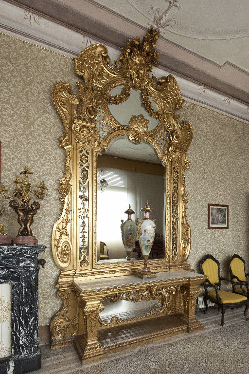 L'importante specchiera in legno intagliato e dorato che poggia sulla coeva console dal piano in marmo bianco, retta da gambe troncopiramidali, risulta decorata da una ricca profusione di conchiglie, festoni floreali e di frutta, testine angeliche, volute, motivi a linee spezzate ed ornati ad intreccio. La parte superiore della cimasa si flette verso e si accosta alla decorazione del soffitto, in un tutto unico.