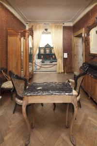 - NOTIZIE STORICO CRITICHE Le pareti dell'antibagno presentano ancora le originali tappezzerie in carta che imita il cuoio impresso di produzione tedesca, come indica il marchio della fabbrica Usta Walton presente sul retro. Tali carte da parati sono una caratteristica dell'arredo di Villa Monastero e si trovano in varie sale: Sala Rossa, Sala Nera, Salottino orientale, camera padronale e in due camere da letto nella foresteria. Nell'antibagno appaiono particolarmente significative e raffinate per il tipo di ornato, di evidente gusto floreale come testimonia l'arredo di Villa Monastero, dovuto a W.E.J. Kees che acquisì e ristrutturò la dimora tra il 1897 al 1906. L'utilizzo delle carte decorate per rivestire pareti risale all'epoca dell'invenzione della carta in Cina, mentre in Europa l'uso fu introdotto nel XVI sec. Le prime fabbriche sorsero in Inghilterra, Francia e Italia nel XVIII sec. Generalmente venivano riprodotte su pannelli di medio formato le decorazioni di pittori famosi, ma in seguito alla aumentata diffusione nel corso del Settecento prevalse l'uso di stampare le carte da parati con motivi decorativi che venivano adattati ai diversi ambienti. Nel secolo successivo vennero prodotti industrialmente: alla tavola di legno inciso che dava solamente fogli di limitata grandezza furono sostituiti i rulli in ottone che stampavano rotoli di carta della lunghezza che si desiderava.
