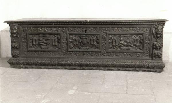 - NOTIZIE STORICO CRITICHE Il cassone presenta motivi decorativi ricorrenti dal sec. XVI al XVII nella tipologia toscana e veneta in particolare: frontale tripartito, fascia di pampini intorno ai tre pannelli frontali, le cui estremità racchiudono una figura giacente o uno stemma, alle estremità cariatidi o mascheroni. Questa particolare forma di cassone ed il motivo ornamentale della ninfa coricata entro cartiglio derivava dalla scuola di Fointainbleu che produceva un'arte essenzialmente decorativa e manieristica e dal 1550 aveva esercitato larga influenza sugli architetti dell'entroterra veneto che ben presto conobbero queste formelle decorative diffuse in tutta Italia, attraverso stampe incise tra il 1542 ed il 1547. Queste corrente artistica influenzava non solo l'esecuzione di stucchi ed intagli cfr. i soffitti di alcune sale e i sedili della sala del collegio eseguiti nella seconda metà del sec. XVI tutti a Palazzo Ducale di Venezia ( Pedrini, p. 19 )\nMa anche l'arredo; si confronti il cassone per il leggio e dorsale del Coro Nuovo nella Basilica di S. Giustina a Padova entrambi realizzati verso il 1527 dal francese Riccardo Taurino e aiuti. E soprattutto l'arredo domestico, si veda un cassone del Kaiser Fr. Museum di Berlino, attribuito a Venezia nel sec. XVII, altro del Museo Bardini attribuito all'Italia settentrionale ( Schottmueller 1921, n. 114 e 118 ); altro del Museo Civico di Padova ( Pedrini 1925, p. 151)\na due cassoni delle Civiche Raccolte di Milano attribuite dalla Rosa ( 1963 pp. 34-35 ) all'Italia centrale pur riconoscendo motivi decorativi propri del Veneto e della Toscana. Ma in particolare si confronti il cassone nuziale quasi uguale al nostro appartenuto a Giovanna Alighieri andata sposa nel 1549 a Marcantonio Serego, attribuito ad artigianato veronese e un altro della collezione Silva di Milano datato verso la metà del secolo ( Alberici, 1980 pp. 98-99 ). D'altra parte si deve ricordare che nel 1527 dopo il sacco di Roma, giungeva a Venezia Jacopo Tatti detto il Sansovino architetto e scultore, fiorentino di nascita, ma romano per formazione artistica. Alcune decorazioni plastiche da lui ideate come il fregio a festoni di frutti e fiori sostenuti da testine femminili, da putti o da leoni e le infinite variazioni della cartella con largo sviluppo di volute e modanature ( cfr. ornamento del prospetto della libreria di S. Marco del 1537 ) trovano libero e largo sviluppo negli arredi coevi sacri e profani e decorano anche questo cassone e l'altro stilisticamente uguale ? di probabile provenienza veronese