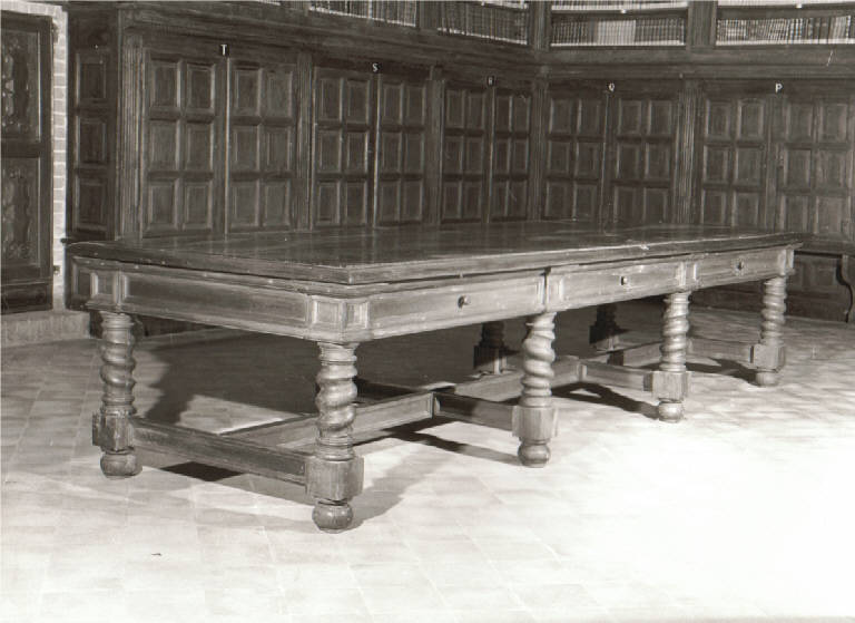 Grandi tavoli rettangolari di massello colore naturale, piano liscio, sui lati maggiori si aprono tre grandi cassetti per parte, con semplice specchiatura e pomello in legno, poggianti su otto sostegni torniti a torciglioni, con piedi a dado terminanti a cipolla, trattenuti da pesante traversa massiccia.