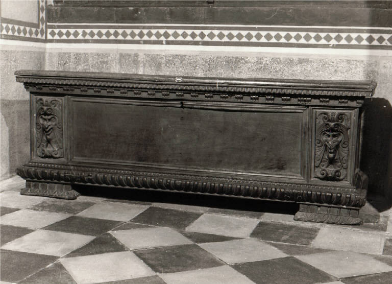 - NOTIZIE STORICO CRITICHE Nella regione veneta e a Venezia in particolare nel sec. XVI le forme manieriste si diffondono parallelamente a Firenze e la cartella assume un carattere meno fortemente stilizzato, le volute si appiattiscono a nastro e si arricchiscono fantasiosamente di mascheroni di carattere fortemente naturalistico e grottesco, cfr. gli arredi lignei nella sacrestia dei SS. Giovanni e Paolo a Venezia della fine del sec. XVI, lo sgabello in noce della collezione Cini di Venezia fine sec. XVI, un cassone veneto, un soffietto da panca di una collezione privata, tutti datati al sec. XVI e attribuiti a Venezia ( Gregori 1981, pp. 3-4, cfr. mascheroni e le volute ). Pertanto si può attribuire questo esemplare all'arte veneta ( anche se i due scomparti laterali e piedi molto bassi potevano far pensare all'Italia centrale ) e realizzato tra la fine del sec. XVI e inizio sec. XVII. Per confronti stilistici molto vicini a questo si veda un cassone veneto conservato nei depositi del Museo Correr di Venezia, datato sec. XVI-XVII che presenta uguali mascheroni laterali ( Alberici 1980, p. 94 ) e un altro coevo delle Civiche Raccolte d'Arte del Castello Sforzesco di Milano, genericamente attribuito all'Italia settentrionale ( Rosa 1963, p. 36 ). E' andato perduto il cartiglio, probabilmente con stemma che di solito decorava il centro della facciata e che è ancora testimoniato dai fori esistenti