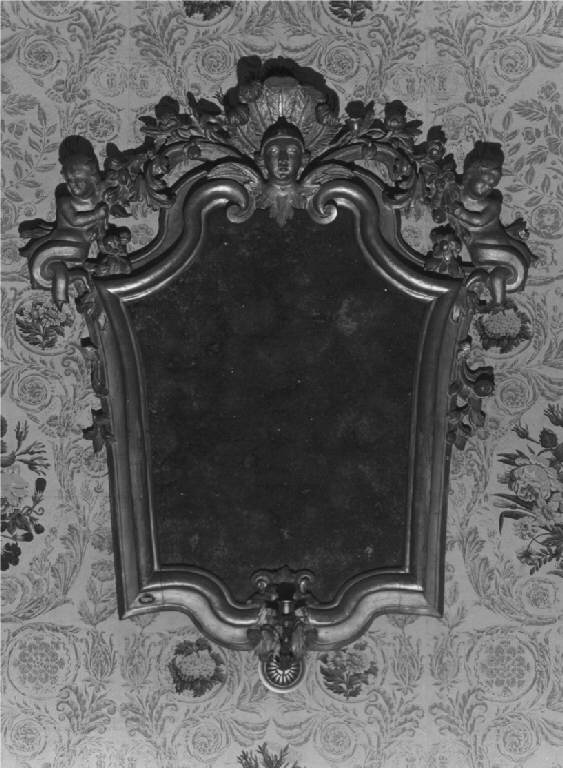 - NOTIZIE STORICO CRITICHE Serie di specchiature realizzate probabilmente in ambito lombardo-veneto agli inizi del secolo XIX con una ripresa di motivi decorativi neobarocchi e tipici motivi ornamentali: putti, struttura sagomata, corone floreali ora di moda fino alla metà del secolo per usi di rappresentanza nei salotti della borghesia dell'Italia settentrionale e centrale. Per confronti stilistici di arredi barocchi, si veda una piccola specchiera toscana del sec. XVIII conservata a palazzo Guicciardini di Firenze ( Gregori 1979, p. 85 )