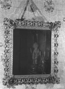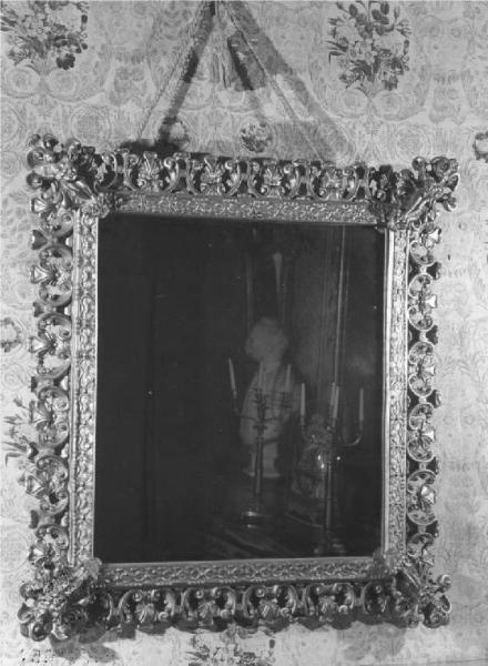 Specchiera pensile di forma rettangolare, in cornice di legno dolce intagliata e dorata, con volute apposte a un motivo a trifoglio stilizzato, sugli angoli figura femminile intera recante fiori, eseguita a forte rilievo, la sagoma interna, abbastanza alta riprende in forma più ridotta il trifoglio della sagoma esterna, specchio pertinente.