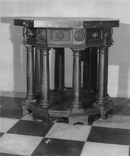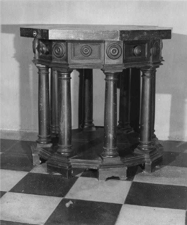 Tavolino di massello di noce, di colore naturale, forma ottagonale con alto piano d'appoggio, quattro cassettini con pomolo di legno tornito alternati a specchiature decorate con tondo entro formelle rettangolari, poggiante su otto colonne tornite poste su base sagomata, con piedi a mensola.