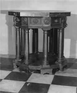 - NOTIZIE STORICO CRITICHE Arredo di fattura piuttosto pesante, realizzato da bottega lombarda nel sec. XX, riprendendo motivi di epoche precedenti ( cfr. le colonne, le decorazioni delle specchiature, i piedi a mensola )