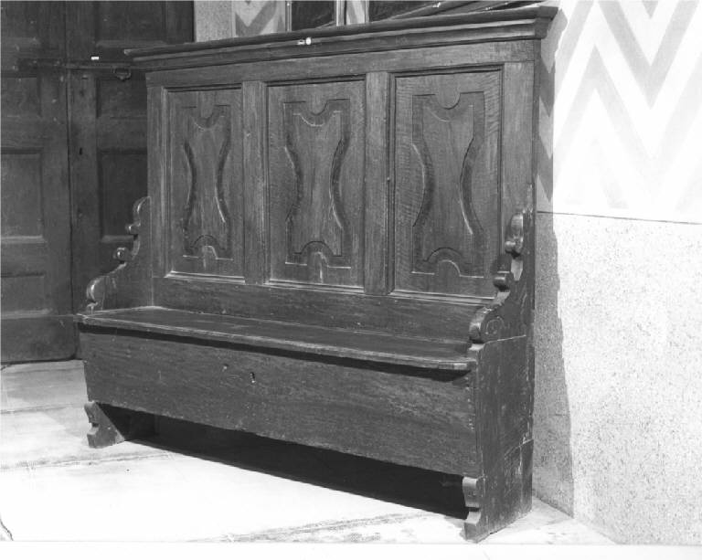 Panca di massello di noce, color naturale lucidato, alto schienale decorato con tre formelle mistilinee poste entro semplici specchiature rettangolari, braccioli intagliati a volute, sedile liscio e massiccio, con sedile ribaltabile poggiante su piedi intagliati.