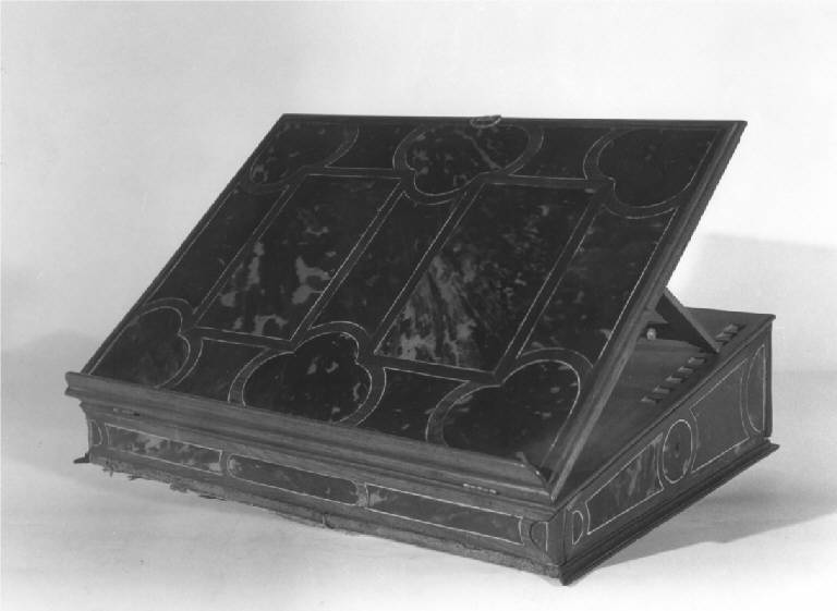 Leggìo mobile, a forma di cassetta rettangolare di legno di frutto decorato con formelle di varie forme di tartaruga, incorniciata da profili in legno e avorio.