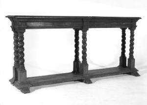 Inginocchiatoio a giorno, massello di noce, piano rettangolare decorato con bordo a dentelli eseguiti a sgorbio e poggianti su sei colonnine tortili, poste su plinti, base rettangolare poggiante su sei piedi ferini.