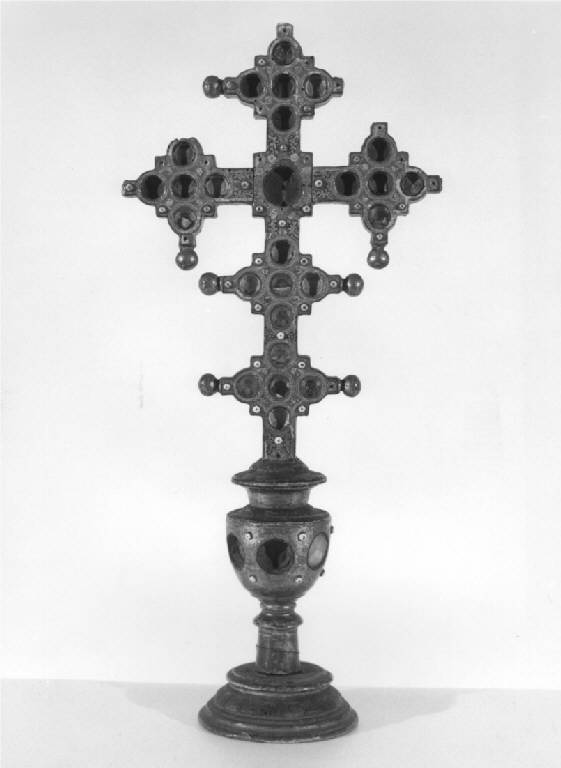 Croce d'altare, su base rotonda con grosso nodo a ghianda decorato con tondi colorati ripresi in tutta la croce polilobata, ornata anche con chiodi dorati.