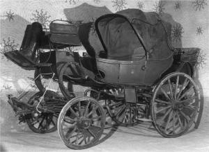 Carrozza padronale a quattro ruote dipinta di nero e verde, del tipo trasformabile, con soffietto ribaltabile e due sportelli, uno per lato, grandi stivaloni fissi, consunti per il cocchiere, seggiolino posteriore per il domestico, il corpo della carrozza è sostenuto da molle e tiranti.