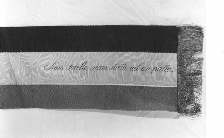 Semplice striscia di taffetas di seta, formata da tre pezzi cuciti a formare il tricolore, canutiglia dorata e applicata.