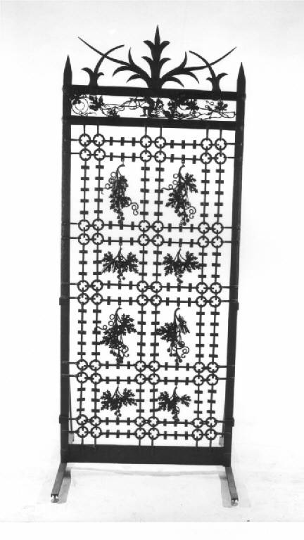Cancello catenario di ferro battuto, ornato con otto grappoli d'uva e pampini divisi da doppia fila di catene e anelli, sulla parte superiore specchiatura e al centro la figura di un uomo inginocchiato intento a tirare con l'arco, ai lati rami d'uva, sormontato da lunghi rami stilizzati