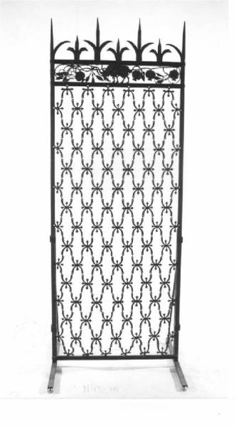 Cancello catenario di ferro battuto, ornato con quadrilobi intrecciati divisi da motivi decorativi a forma di croce, sulla parte superiore specchiatura con al centro capricorno, ai lati rami intrecciati di melograni dai grossi frutti, sormontato da lunghi rami stilizzati di diversa misura.