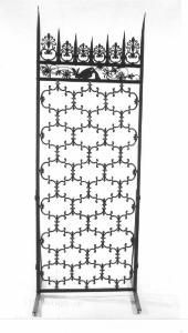 Cancello catenario di ferro battuto, ornato con cartelle formate da volute, parte superiore con specchiatura decorata con urna rovesciata da cui esce l'acqua, ai lati rami di crisantemi intrecciati, sormontato da aculei alternati a motivi floreali intrecciati.