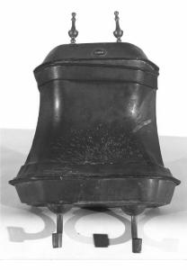 Vasca a muro per l'acqua, di rame martellato e con patina ancora originale, a forma quadrangolare convessa ai lati più lunghi e sporgente alla base, sormontata da coperchio rigonfio e ornato con due pomoli "a fuselli" d'ottone fuso.