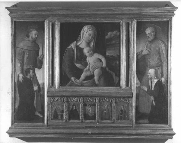 - NOTIZIE STORICO CRITICHE Il polittico è stato ricomposto in tempi recenti con tavole di autore e provenienza diversa. Tuttavia la Madonna col Bambino sembra di poterla attribuire al Boccaccino del periodo 1509-11 quando è a Venezia, influenzato da Giovanni Bellini e ripete composizioni di analogo stampo. I ritratti dei due devoti committenti, d'autore non identificato, sono realizzati con semplice realismo secondo la tipologia della ritrattistica lombarda probabilmente d'ambiente bergamasco-lombardo. Mentre le cinque formelle, su sfondo oro entro cornice coeva intagliata a racemi dorati, sono di scuola lombarda pavese del terzo venticinquennio del sec. XV.