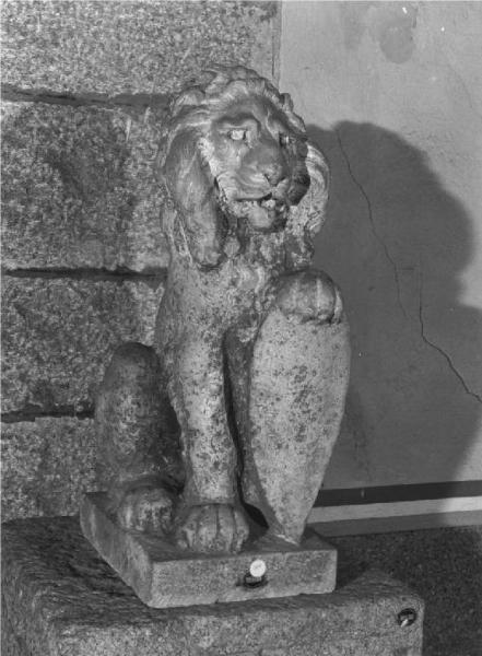 Leone di pietra, accovacciato, in posizione frontale e con le fauci aperte, regge con la zampa destra uno scudo dirittoposto su basamento quadrangolare liscio, lavorato nella parte posteriore.