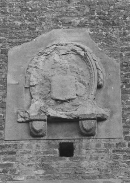I due rilievi in pietra scolpita sono quasi illeggibili per il cattivo stato di conservazione, uno è posto su due mensole, tondo ornato con piccole foglie ritmate e corona d'alloro, al centro tracce di uno stemma, il secondo è una formella rettangolare scolpita a rilievo, con stemma, la parte sinistra illeggibile, la destra rigata