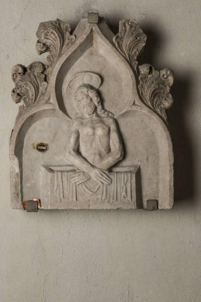 - NOTIZIE STORICO CRITICHE Il frammento di rilievo, appartenente probabilmente a un sepolcro smembrato, per il materiale usato, la qualità del modellato, la pacata sofferenza del Cristo, è attribuito a scuola lombarda dell'inizio quattrocento