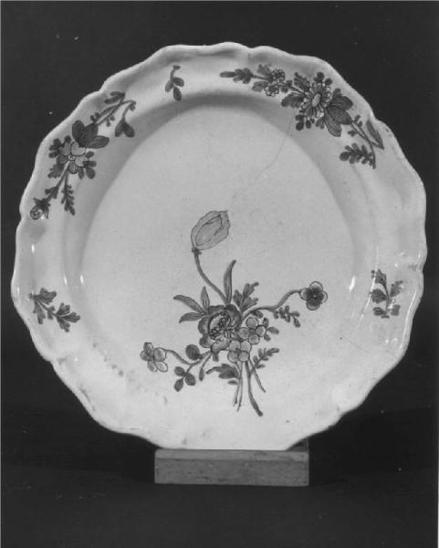Piatto con tesa baccellata e sagomata, orlo rialzato decorato a gran fuoco in policromia, decorazione con mazzo di fiori in giallo ocra, arancio, blu e verde marcio sul cavetto e due mazzolini alternati a rametti verdi sulla tesa.