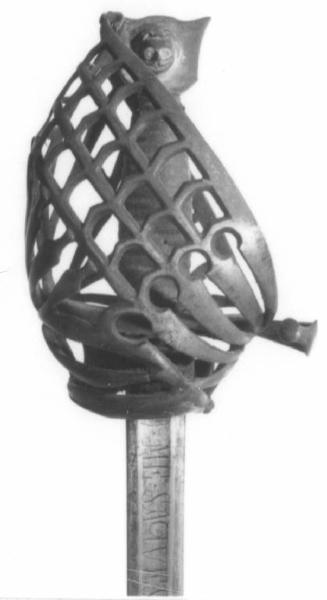 Pomo in bronzo a testa di gatto, decorato al centro da testa antropomorfa, impugnatura fasciata di corda e lavorata a tortiglione, fornimento con guardia a ricciolo, gabbia in quattro rami obliqui finiti a picciolo con altro listello incurvato, dai denti escono tre ponticelli inferiori dinanzi e due dietro, dove è anche l'arco per il pollice, contragguardia di un ramo accompagnato da quattro rami obliqui di cui due biforcati, braccio di parata finito a bottone e sporgente in avanti, lama non pertinente (più antica) a doppio filo, con larga sgusciatura al forte con iscrizione e a sezione esagonale.