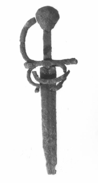 Pomo a fico, blocchetto poco cuspidato, resti di un anello, archetti e ponticello, guardia ad arco molto stretto e braccio di parata piegato in avanti nel piano ortogonale alla lama, lama a due fili con sgusciatura mediana, guasta e solo parzialmente conservata.