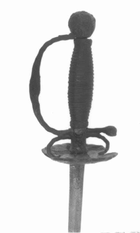 Fornimento con pomo sferoide privo di bottone e basettina, decorato con fiori e foglie, impugnatura di legno a sezione rettangolare, manica a cordelline di filo di ferro e filetti di rame tra due teste di moro, blocchetto rettangolare ingrossato alla base da intagli con fogliami e fiori, guardia fissa al pomo con rigrosso al colmo intagliata, braccio di parata terminante in rigrosso bulbato e intagliato, coccia a doppia valva simmetrica intagliata su entrambi i lati con fregi vegetali e fiori, lama non pertinente lenticolare al forte dove è inciso decoro floreale e una margherita a otto petali, indi a sezione esagonale.