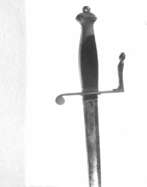 Fornimento in ottone, guardia monoelsa a balaustro, cappetta corta, svasata in alto e sormontata da un coppellotto inciso a spicchi con bottone, impugnatura in legno zigrinato, a sezione quadra variabile fermata in basso da ghiera, resti del riparo in velluto rosso, lama ricurva con tallone sgusciato a un filo e punta sgusciata ai lati.