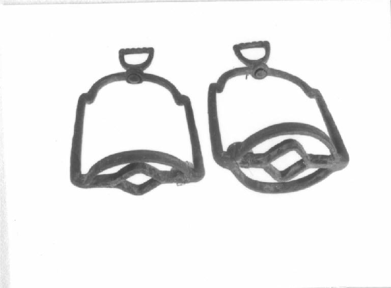 Branche in tondino a profilo mistilineo, occhio semicircolare sagomato e decorato a toccature nella barretta superiore, predellino in lamina piatta con una barretta a sezione quadrata che si sdoppia a formare un quadrato, una delle due staffe è priva di un archetto del predellino.