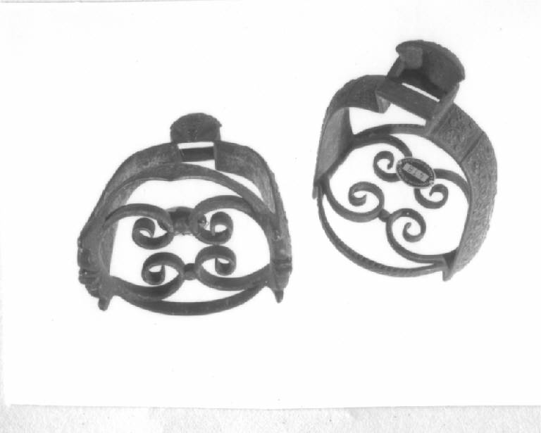 Occhio scatolare allargato verso l'alto e terminante in una luna sporgente, parte anteriore sbalzata a spicchio appuntato verso il basso e terminante in due piccole punte, arcata poco calante, finita a graffa, predellino circolare con archetti in lamina, a sezione variabile, dei quali l'anteriore è appuntato in basso, all'interno del predellino vi sono due doppi riccioli simmetrici in lamina a sezione quadrata, uniti a due a due mediante il rigrosso, le staffe sono completamente incrostate d'argento e in parte dorate a fitti fogliami e fioriture diversamente disposte, profilo puntinato alle branche e toccature agli archetti.