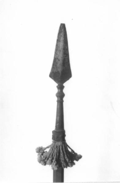 - NOTIZIE STORICO CRITICHE Si tratta dell'arma propria dei sergenti bombardieri e proviene dalla semplificazione del buttafuoco inastato del quale non ha più i morsetti che trattenevano il miccio acceso in batteria (Boccia, Godoy, Museo Poldi Pezzoli. Armeria I, Milano 1985, p. 161, cat. 539). esemplari simili sono le mezze picche cat. 553-555 del Mueso Poldi Pezzoli (Boccia, Godoy, Museo Poldi Pezzoli. Armeria I, Milano 1985, p. 395, fig. 580-582)