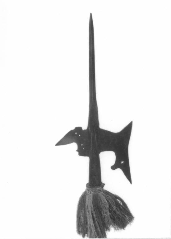 Gorbia con bandelle, deviata all'indietro, con ferro fino allo stacco del quadrello a sezione di rombo, scure allungata ma non ancora lunata, filo poco obliquo e concavo, gobba stondata in basso e crocetta decussata a giorno, becco col lembo di uscita ugnato due volte in basso e una in alto con quattro fori dal ferro, asta moderna e nappa.