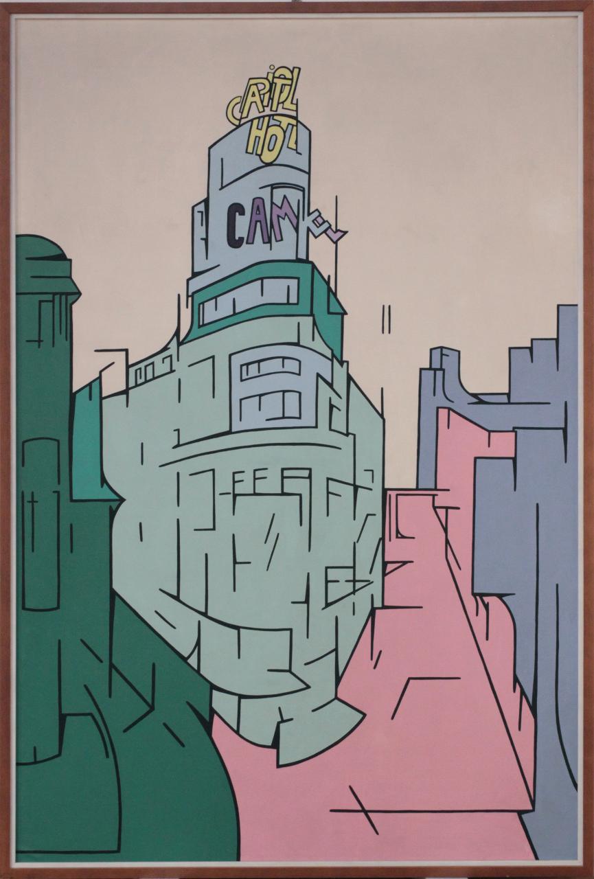 Veduta di Madrid con il Capitol Hotel, su cui è affissa una insegna pubblicitaria Camel, resa con disegno sintetico e campiture di colore piatte, propri dello stile pop o fumettistico.