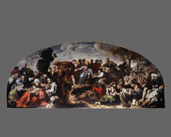 - NOTIZIE STORICO CRITICHE Attorno al 1620 Domenico Fetti dipinge questa grandiosa lunetta per il refettorio della chiesa di Sant'Orsola, fondata da Margherita Gonzaga d'Este, alla cui morte (1618) l'artista compone anche un componimento poetico, allegato all'orazione funebre (SAFARIK 1990, p. 333 n. 22bis). Nel convento delle orsoline il quadrone è segnalato per la prima volta da CADIOLI (1763 , pp. 74-76): a nessuna opera d'arte egli dedica nella sua Descrizione tanto spazio e tante lodi. Nel 1786 Giovanni Bottani include la tela tra quelle da portare nel Regio Ginnasio: lì essa è nel 1793 quando la vede LANZI (1793 [ed. 2000], p. 164), che appunto la descrive "Nello [-] studio"; lo stesso LANZI (1795-1796, p. 248) in seguito segnala "la Moltiplicazione de ' pani è ora nell'accademia di Mantova; pieno di figure veramente grandi piuttosto che grandiose; ma variate, scortate, colorite da buon maestro". La lunetta sarebbe giunta presso la biblioteca nel 1794, secondo la SICOLI (1998, p. 304), ma forse non prima del 1799, quando Volta per lettera ne chiede appunto lo spostamento (cfr. p. 13). Attorno al 1794 comunque la Moltiplicazione dovrebbe essere stata restaurata; un secondo intervento è documentato nel 1863, quando la tela è inviata, assieme al tizianesco Cristo che appare alla madre di Medole, a Venezia. Nel 1892 il lunettone è trasferito, assieme al Tempio della Trinità di Rubens, nel Museo Civico presso il palazzo Accademico (cfr. p. 29); lì un nuovo restauro è effettuato nel 1911-1912, alle soglie del trasferimento in palazzo Ducale, che avviene nel 1915 (TAMASSIA 1996, p. 59), anche per motivi di sicurezza, vista l'entrata dell'Italia in guerra. Nel 1917 la Moltiplicazione è temporaneamente ricoverata a Firenze, e da lì torna entro il 1921, per essere nuovamente restaurata, proprio nel 1921, nel palazzo Ducale dove da allora è esposta (TA MASSIA 1996, p. 49). Il soggetto è tratto ovviamente dai Vangeli (Mt 14,1 3-21; Mc 6,34-42; Lc 9,13-17; Gv 6,5-13). La composizione è la più articolata tra quelle dipinte da Fetti, un hapax in un catalogo formato per lo più da opere di grandezza media o piccola. Per articolare la composizione l' artista si è ispirato alla pittura del Tintoretto e in particolare ai soffitti della scuola veneziana di San Rocco. Tre gruppi di figure occupano l' enorme lunetta, posti in geometria triangolare: a lati due gruppi più avanzati e al centro uno più arretrato, nel quale spicca la figura di Cristo intento a saziare le turbe. La pennellata rimarca la collocazione spaziale: più compatta e densa nei primi piani, più filamentosa, rapida ed evanescente nel secondo piano, mentre le forme sono quasi solo suggerite nella lontananza. Dopo una proposta iniziale della ENDRES-SOLTMANN (1914, p. 30) al 1615-1616; NEUMANN (1966-1967, pp. 68 e 74 nota 25) sulla base di a me ignoti documenti indicatigli dalla Perina, afferma che la tela esisterebbe già nel 1616; la critica recente tende invece una datazione verso il 1620 e SAFARIK (1990, p. 19) ha supposto che un pagamento effettuato nel 1619 dalla corte a favore di Fetti sia un anticipo per lo straordinario incarico. Nessun dubbio è stato mai espresso circa la paternità dell'opera, ma varrà la pena segnalare che presso la Fototeca della Fondazione Roberto Longhi le foto della lunetta recano sul retro, per mano dello studioso, annotazioni col nome di "Monsù Bernardo", ossia Keilhau: certo a suggerire un'affinità stilistica col pittore danese, che LONGHI nel 1938 mette in relazione con Fetti. Anche Volpe (in Mostra di Opere Restaurate 1980, p. 32) insiste nell'accostare Fetti agli artisti d'Oltralpe, in particolare quelli attivi a Roma agli albori del XVII secolo; a questa determinante influenza lo studioso aggiunge quella della pittura romana e fiorentina del tempo, escludendo invece - anche per un'opera matura come la nostra - qualsiasi tangenza con l'arte veneziana. La proposta di rintracciare nel Cristo della Madonna del popolo del Barocci agli Uffizi, il modello per il Redentore della nostra tela (MORSELLI 2009, p.188), non mi persuade. È stato proposto di indicare nella figura all'estrema destra del dipinto un autoritratto (E.A. Safarik, in Domenico Fetti 1996, pp. 173-177), ma non è il solo volto rivolto a noi: anche il giovane nel margine sinistra, sopra il vecchio con berretto rosso, ci punta lo sguardo. LEHMANN (1967, p. 96) suggerisce che, nella turba da sfamare, la figura femminile che con la mano indica Cristo possa essere un ritratto di Margherita Gonzaga. Ma la donna era verosimilmente morta, quando il lunettone viene dipinto. La GRISERI \n(1966, p. 17 8) suggerisce un accostamento tra un disegno di collezione privata, che attribuisce a Fetti, e la "Caduta della manna", titolo col quale immagino voglia riferirsi al lunettone; l'abbinamento è improprio e anche l'attribuzione a Fetti del foglio, ora conservato a Stoccolma (National Museum, inv. NM 277/1968), è stato a ragione messa in dubbio (BJURSTROM 1979).(L'OCCASO 2011,pp. 308-309). (PROSEGUE IN OSS)