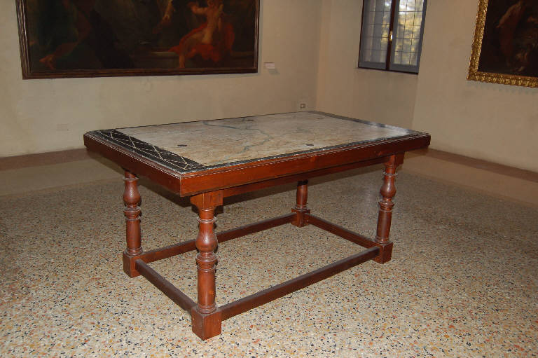 Tavolo a quattro gambe con piano superiore rettangolare in notevole aggetto, con bordo ligneo modanato. Il piano in scagliola comprende al centro un disegno delineato in azzurro su fondo bianco dell'idrografia del Ducato di Mantova. La planimetria è compresa entro una riquadratura nera, i cui i lati più corti presentano bande più larghe percorse da un motivo romboidale. Le quattro gambe sono a balaustro nella parte superiore e di forma essenzialmente cilindrica nella parte inferiore. Gli elementi cubici di raccordo con le traverse perimetrali di semplice sezione quadrangolare fungono pure da piedi.