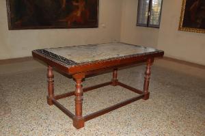 - NOTIZIE STORICO CRITICHE La tavola in scagliola - inserita in un tavolo da presumersi di fattura novecentesca - raffigura la planimetria del sistema idrografico del ducato gonzaghesco con l'evidenziazione in azzurro dei corsi d' acqua e dei canali e della città di Mantova con il sistema lacustre che l'attornia.\nL'Ozzola descrive il tavolo nella sala del Crogiuolo e ne ipotizza un'attribuzione a Giacinto Stancario, che dal 1676, dal duca di Mantova, fu nominato, a vita, scultore di corte e fabbricante di tavolini in scagliola. Sempre secondo l'Ozzola l'oggetto proviene dal convento di San Paolo. A seguito della soppressione del convento - da presumersi non fosse comunque quello di San Paolo - e della sua trasformazione in ufficio delle Poste, l'opera fu ceduta al direttore del Museo Patrio nel 1853.