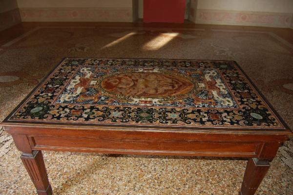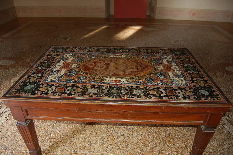 - NOTIZIE STORICO CRITICHE Tavolo in stile Luigi XVI costruito appositamente, presumibilmente tra la fine del XVIII e gli inizi del XIX, per contenere il manufatto in pietre dure. Una forma del tutto simile presenta un altro tavolo di Palazzo Ducale reggente un'analoga opera in commesso di pietre dure riferibile come la presente ad una manifattura fiorentina o più probabilmente romana della seconda metà del XVI secolo o della prima metà del XVII secolo. L'Ozzola descriveva l'oggetto all'interno della Sala dei Principi. Non presenta marchi o etichette inventariali.\nL'impianto compositivo del manufatto organizza gli elementi decorativi in regolari partiture, che fanno da cornice ad un grande pannello centrale. La lavorazione a "commesso" di un piano di tavola prevede la realizzazione dei motivi decorativi a mosaico, cioè formati dall'accostamento di sezioni lapidee di differenti dimensioni. Sulla base di un modello preparatorio a grandezza naturale, il maestro intagliatore esperto di pietre definiva le numerose sezioni che avrebbero composto a mosaico l'insieme, e sceglieva i diversi marmi policromi, da cui venivano ricavate col taglio a lame di ferro, impiegate con acqua e sabbia, delle lastre sottili, dello spessore di circa 3/4 millimetri. Queste venivano poi ritagliate secondo la sagomatura prevista dal disegno mediante l'azione combinata di un filo di ferro sotteso ad un archetto di castagno e di una "spottiglia" (sabbia decantata ad alta componenete silicea), applicata con una spatola dall'operatore ad ogni passaggio del filo entro il taglio. Pregio e vanto di questi lavori era appunto la perfetta connessione dei singoli elementi lapidei, che già ritagliati con precisione grazie alla virtuosistica abilità dei maestri intagliatori subivano inoltre una limatura dei bordi, per eliminare la pur minima scabrosità. I singoli pezzi venivano quindi fissati al supporto prescelto. Ultima e delicata fase finale della lavorazione era la lucidatura (GIUSTI 1986, pp. 194-199).