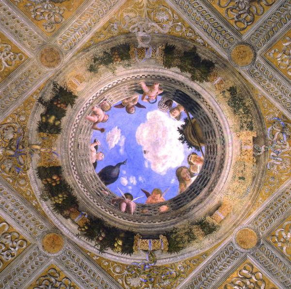 - NOTIZIE STORICO CRITICHE La denominazione di Camera Picta è dovuta alla decorazione integrale di soffitto e pareti dell'ambiente, realizzata con tecnica mista ad affresco e a tempera. La presenza di una targa sulla parete ovest, dove Andrea Mantegna dedica la propria tenue opera ("opus hoc tenve") ai marchesi, nonché committenti e sposi, Ludovico II Gonzaga e Barbara di Brandeburgo, giustifica il noto appellativo di Camera degli Sposi. L'artista padovano lavorò alla realizzazione dell'apparato decorativo tra il 1465 ed il 1474. La prima data è riportata sullo sguancio sinistro della finestra nord, la seconda si legge al termine della dedica ai marchesi. Sulla parete ovest, tra i fiorami di uno dei finti pilastri, si riconosce un volto maschile che è stato identificato come l'autoritratto dello stesso Mantegna. \nLa stanza appare cubica in quanto il soffitto gotico ad ogiva è stato rialzato tramite lunette e trasformato in una volta a padiglione. La decorazione simula proprio una costruzione architettonica a padiglione. Un alto basamento marmoreo sostiene alcuni pilastri, che reggono la volta, dotati di veri capitelli pensili in stucco. Tendaggi dorati dipinti proteggono la struttura dall'ambiente esterno, ma su due lati sono scostati e, simulando un sipario, mostrano scene della vita di corte. La volta, con decorazioni a monocromo su fondo dorato, si apre su di un cielo nuvoloso tramite un oculo, dal quale si affacciano figure di putti, cortigiane, un uomo di colore, un pavone. Questo sfondamento prospettico aiuta l'illusoria trasformazione della stanza in un padiglione immerso nella natura. Circondano l'oculo i ritratti di otto Cesari all'interno di ghirlande sostenute da putti. Completano la decorazione del soffitto finti bassorilievi dipinti con le imprese mitiche di Ercole, Orfeo ed Arione. Nelle lunette, da dove s'intravede il cielo, sono appesi festoni di frutta e medaglioni con alcune imprese gonzaghesche: Sole, Cervetta, Torre, Scoglio, Cane rivolto, Ali, Idra.\nSulla parete del camino è rappresentata la corte mantovana al momento di ricevere un'inattesa missiva da parte di Bianca Maria Visconti Sforza. La duchessa milanese invita Ludovico II a recarsi immediatamente al capezzale del marito. Il compito del marchese, luogotenente generale di Francesco Sforza, è quello di garantire l'eventuale successione del primogenito del duca, Galeazzo Maria. Quel giorno però, 1 gennaio 1462, la famiglia Gonzaga si apprestava a festeggiare il secondogenito Francesco, di recente nominato cardinale da papa Pio II e proveniente da Milano.\nMantegna ritrae Ludovico II, mentre si consiglia col segretario, e la moglie Barbara, entrambi seduti. Dietro si riconoscono i figli: Gian Francesco (alla sinistra del padre), la piccola Paola (con una mela in mano), Rodolfo (dietro la madre), la bionda Barbara. Nella figura maschile con cappello nero, posto tra Gian Francesco e Rodolfo, è stato riconosciuto Leon Battista Alberti. La donna dietro Barbarina è forse una nutrice di casa Gonzaga o, come sostengono alcuni studiosi, Paola Malatesta, madre di Ludovico II, in abito monastico; in basso sta la famosa nana di corte, che guarda direttamente lo spettatore. Sotto al marchese è accucciato il cane prediletto di Ludovico II, che diventa metafora della fedeltà del signore verso i propri doveri politici e militari. Ludovico II parte per Milano. Sulla parete ovest è dipinto l'incontro del marchese con il figlio Francesco, avvenuto a Bozzolo lo stesso 1 gennaio 1462. Il cardinale tiene nella mano destra una lettera, probabilmente la medesima recapitata al padre nella scena della Corte e nella sinistra la mano del fratello Ludovico (futuro vescovo), che accompagna il nipote Sigismondo (futuro cardinale). Ludovico II ha al proprio fianco il piccolo Francesco (futuro IV marchese). Il padre di quest'ultimo, Federico I, si trova all'estremità destra della scena, addossato ad un pilastro. Di fronte al III marchese di Mantova, è stato riconosciuto l'imperatore Federico III d'Asburgo e, tra i due, il re di Danimarca Cristiano I di Oldenburgo. La presenza dell'imperatore serve a ribadire la fedeltà che gli porta il committente dell'opera.\nL'episodio dell'Incontro, nella realtà dei fatti verificatosi nei pressi di Mantova, viene invece ambientato da Andrea Mantegna alle porte di Roma: si riconosce la piramide di Caio Cestio, il Colosseo, Castel Sant'Angelo. Sullo sfondo sono state delineati i centri urbani di Tivoli, Palestrina, Tuscolo, Palombara Sabina. Questi paesaggi romani sottolineano la devozione dei Gonzaga alla Chiesa ed il fascino delle rovine classiche, idealizzate dall'Umanesimo, eleva culturalmente i marchesi. Inoltre queste vedute architettoniche danno indicazioni cronologiche per datare l'evento: la fortezza in costruzione alla destra dell'arco roccioso è infatti la Rocca Pia di Tivoli, voluta da Pio II nell'agosto del 1461. Verso Tuscolo viaggia poi la carovana dei Magi, raffigurata in un giorno intermedio tra Natale e l'epifania.