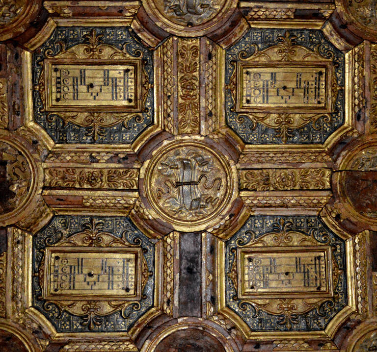 - NOTIZIE STORICO CRITICHE Il periodo di Francesco II ed Isabella d'Este è senza dubbio il più ricco per quantità e qualità di decorazioni. Numerosi gli artisti che operarono tra fine Quattrocento e inizi Cinquecento, per lo più al servizio di Isabella d'Este; alcuni stabilmente a corte, altri occasionalmente. Da Ferrara Isabella d'Este, figlia di Ercole I d'Este e Leonora d'Aragona, giunse nel 1490 in sposa a Francesco II, ed occupò un appartamento al piano nobile del Castello di S. Giorgio, collocato sopra quello del marito Francesco. Nella cultura della marchesa rimase fondamentale il cosiddetto "fattore ferrarese", lo stimolo al paragone ed alla competizione con la corte estense nella quale si elaboravano nuove e raffinate soluzioni decorative e iconografiche. Con queste premesse dobbiamo guardare alle prime creazioni promosse da Isabella nel Castello di S. Giorgio, in una serie di camere e camerini che si raccolgono intorno alla torre sud-est. I lavori iniziarono subito: Gian Luca Liombeni già nel 1491 dipingeva dei fregi, ma forse solo dalla metà del decennio iniziò un'incalzante serie di commissioni che videro impegnati numerosi artisti; verso la fine del secolo probabilmente l'Appartamento era almeno parzialmente decorato. La suite è composta da ambienti di vaste dimensioni (in primis la camera delle Armi, successivamente ridecorata alla metà del Cinquecento), ma soprattutto una serie di camerini: all'interno della controtorre rivolta verso il rivellino di San Niccolò troviamo i camerini dei Nodi e delle Catenelle, raggiungibili da una scala che scende dalla sala delle Armi, ed il camerino delle Fiammelle al di sopra. Nella controtorre nord, verso il ponte di San Giorgio, erano collocati uno sopra l'alto lo Studiolo e la Grotta. Un recente intervento di Brown ha chiarito le dimensioni dei due ambienti, ed il complesso sistema di rampe che mettevano in collegamento Grotta e Studiolo con le sale delle Cappe e delle Armi, e lo Studiolo con l'altana sovrastante. Sotto lo Studiolo, raggiungibile da una scaletta laterale che scendeva dalla sala delle Armi (l'attuale ingresso è certamente posteriore), si trova la Grotta; questo nome compare per la prima volta nel 1498. Brown, ritiene che lo Studiolo di Ludovico II sia stato trasformato, all'epoca di Isabella, nella Grotta. Sotto la volta lignea isabelliana compare, forse a sua volta sovrapposta ad altro intonaco dipinto, una raffigurazione con Segni zodiacali su fondo di azzurrite piuttosto rovinato, che potrebbe essere realmente dell'epoca di Ludovico II (1444-1478). Brown riferendosi alla decorazione zodiacale, attribuì l'opera a Bernardo Parentino che nel 1496 lavorava per Isabella d'Este in uno studiolo. Questa decorazione fu nascosca dalla volta a botte che la stessa Isabella commissionò, e che fu probabilmente realizzata dai fratelli intarsiatori Antonio e Paolo Mola (1506-8); è stato correttamente osservato che le date relative al Parentino coincidono con le prime richieste di tele per lo Studiolo sovrastante, ed è quindi probabile che le pitture fossero state lì realizzate. Dopo la morte del marito, Isabella decise di spostare il proprio Appartamento dalle stanze del Castello agli ambienti in Corte Vecchia e qui trasferì quanto più potè del famoso ensemble faticosamente raccolto (L'OCCASO 2003, pp. 138-144).\nDell'arredo originale, trasportato nell'Appartamento della Grotta in Corte Vecchia, è rimasto in loco solo il soffitto in legno dorato, decorato con gli emblemi isabelliani del Lotto e delle Pause, opera dei fratelli Mola. Isabella amava molto l'impresa delle Pause, detta anche delle "Note musicali", e la utilizzo per la prima volta nel 1502 quando la fece ricamare sull'abito che indossò alle nozze del fratello Alfonso d'Este con Lucrezia Borgia. La figura, che non ha alcun senso musicale, era composta unicamente da pause. Si può decifrare la partitura in intavolature italiane secondo questa indicazione: 1: la chiave di contralto (voce di Isabella); 2: i simboli dei 4 tempi; 3 e 4: delle triple pause; 5 e 6: delle doppie pause; 7: una pausa; 8 e 10: due semipause. Ricordiamo le pause nell'ordine inverso, fino al n. 16 dove si trova il simbolo della ripetizione. Forse Isabella, seguace di Ficerio e del neoplatonismo, voleva alludere al fatto che la musica, che aveva un largo spazio nella sua vita, non era perfetta che quando si ascoltava in un silenzio ripetuto, pretesto per le più alte meditazioni. L'impresa del Lotto raffigura i biglietti di una lotteria (polizze o brevi) legati in un unico mazzo (BEGUIN 1975).\nDal 1531 al 1899 l'ambiente fu utilizzato come passaggio per accedere alla palazzina della Paleologa.