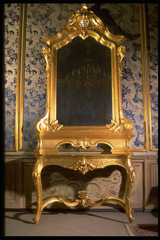 Console in legno dorato e superficie in onice con specchiera in legno intagliato e dorato