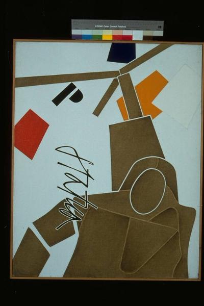 Il desiderio del pittore. Al centro, grande forma di colore marrone, generata dall'incrocio di altre forme, con accanto la scritta "statua"; in alto, forme trapezioidali multicolori ed una lettera P
