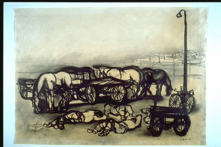 Carrettieri. Tre uomini dormono, sdraiati a terra; attorno a loro, carri trainati da cavalli in riposo e una bicicletta