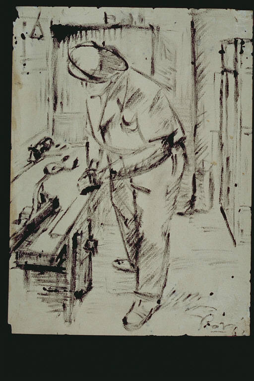 - NOTIZIE STORICO CRITICHE Il disegno venne donato dall'autore in occasione della personale del 1999.\nLa figura è resa con tratti veloci , leggeri ma decisi, che creano abilmente la suggestione della velocità del lavoro dell'artigiano. La descrizione ambientale è sommaria, fatto salvo il bancone di lavore, presentato mediante una scrittura insistita. Il volto del personaggio è suggerito da linee ellittiche, secondo una suggestione cubista.\nL'artista è nato nel 1931 a Luzzara e frequenta la scuola "Arti e Mestieri " di Suzzara. Nel 1951 si iscrive all'Istituto d'Arte "Paolo Toschi" di Parma. In questo periodo si applica soprattutto in disegni a pastello, gessetto e sanguigna, sui temi del ritratto e studi di nudo. La svolta in direzione scultorea è favorita dall'attenzione verso le opere di alcuni scultori presentate al "Premio Suzzara", ad esempio Gorni, Fabbri , Paolini, ma soprattutto Murer. Partecipa al Premio nel 1952, nel 1968 e nel 1970. Nel 1959 si trasferisce per lavoro a Milano, dove vede numerose mostre . Solo alla fine degli anni Sessanta entra in contatto con Messina e Minguzzi, grazie ai quali conosce Manzù. Nel 1984 si trasferisce in Africa e attraverso l'incontro con la scultura africana riflette sul problema dell'arcaismo e del primitivismo.