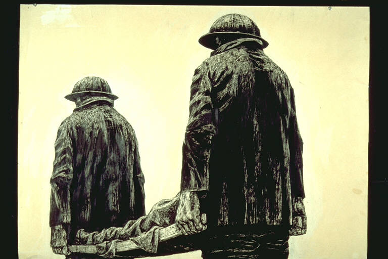 Tragedia nella miniera. Due figure maschili con elmetto in testa trasportano una barella