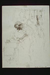 - NOTIZIE STORICO CRITICHE Alla XIIa edizione del Premio Suzzara (1959) vinse £. 10000 ed un paio di scarpe.\nCon un tratto molto frammentario e convulso, l'artista delinea per sommi capi la figura del macellaio e della sua bottega, avvicinandosi, nella delineazione di questi ultimi, a certi esiti "action".\nL'artista nasce a Milano nel 1929. Studia all'Accademia di brera. Comincia ad esporre nei primi anni '50, alle mostre delle Accademie di Belle Arti italiane a Milano e a Torino, al Premio Diomira, alla Galleria d'Arte Moderna di Milano ed al Premio Suzzara. Le opere che dipinge dal 1956 al 1959 rientrano nell'ambito della Nuova Figurazione come la serie delle "Macellerie" (cui questo disegno appartiene), quelle degli interni (gabinetti, scale, cucine di abitazioni popolari e dimesse) e quelle delle case in rovina o degli edifici sventrati dai bombardamenti. Negli anni '60 svolge opere ispirate all'osservazione degli scheletri di animali e delle ciminiere delle navi. Per le opere degli anni '70, invece, si ispira ad eventi di cronaca il cui denominatore comune è la violenza. Durante tutta la sua produzione un tema che rimane costante è la figura femminile. Le più importanti rassegne collettive cui partecipa sono: la Biennale di Milano, la biennale dell'Incisione taliana contemporanea di Venezia , la Triennale dell'Incisione di Milano, la mostra "Il Realismo esistenziale: 1955-1965" (Milano, Palazzo della Permanente, 1991). Presenta anche varie personali sopratutto a Torino e a Milano.