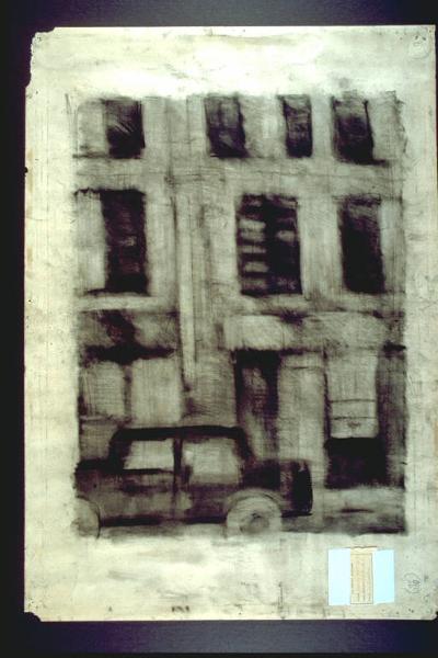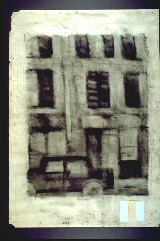 - NOTIZIE STORICO CRITICHE La veduta è resa con un tratto generalemente sottile, accurato, evanescente ed evocativo. Solo i profili dell'automobile e alcuni punti delle imposte delle finestre sono più insistiti.\nL'artista è nato nel 1932 a Milano. Ha cominciato ad esporre nel 1959. Nato come pittore, era "partito da una figurazione che trovava un rinnovamento espressivo nella dissolvenza delle forme in una trama di segnie e di coaguli cromatici." Subentravano successivamente elementi dell'informale. con la mostra milanese all'Agrifoglio, nel 1975, è ancora impegnato in ricerche pittoriche, ma già comincia ad affacciarsi una "nuova" idea della macchina. Il movimento sarà lo stimolo che porterà verso la scultura; il suo percorso si snoda in vari progetti , come quello del Parco per la Biennale di Venezia, quello scultoreo per Piazza Giovine Italia a Milano, quello per i Giardini di Via Palestro. esistono tuttavia anche avanzate lavorazioni , a riprova di una volontà e capacità totale di integrazione e propensione verso nuovi linguaggi.