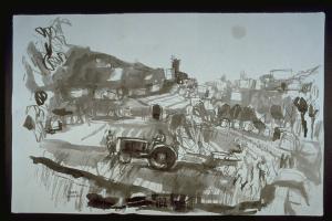 - NOTIZIE STORICO CRITICHE Alla XVIIa edizione del Premio Suzzara (1964) vinse premi in denaro per un valore complessivo di £. 18000, un prosciutto e salumi.\nIl paesaggio è descritto in maniera convulsa ed immediata; la campagna ed i contadini sono evocati da segni leggeri e stilizzati; solo il trattore è definito in maniera più insistita. Il disegno fa parte di una serie eseguita dall'artista dopo un viaggio a Parigi dal quale riporta disegni, acquerelli e cartoncini ad olio, che lo porta a riscoprire i colli di Teolo in cui ritrova l'atmosfera idilliaca di Burano.\nL'artista nasce a Venezia nel 1903 e vi muore nel 1977. Frequenta l'Istituto Tecnico Statale di Venezia e la scuola serale dell'Istituto d'Arte. Frequenta i corsi di decorazione pittorica e di illustrazione del libro all'Istituto Statale d'Arte.Nel 1923 vince ex-aequo il I premio al concorso per l'illustrazione della rivista "El Hogar" di Buenos Aires. Dal 1925 al 1938 pubblicherà i suoi disegni sulla rivista "Le Tre Venezie". Nel 1927 tiene l sua prima personale di bianco e nero alle Botteghe d'Arte di Venezia. Nel 1928 partecipa alla XVI Biennale di Venezia. Inizia l'attività di insegnante di arti grafiche. Nel 1930 presenta la sua prima personale di pittura, sempre alle Botteghe d'Arte di Venezia. E' legato agli artisti della Scuola di Burano. In questi anni si dedica maggiormente alla pittura. Partecipa alle Biennali di Venezia del 1934 e del 1936. Continua la sua attività di illustratore per libri e riviste. Dal 1943 ha inizio la sua partecipazione alle Quadriennali di Roma. Dal 1946 iniziano i riconoscimenti: Premio Burano; Premio Volpi alla XXV Biennale di Venezia nel 1950; Premio Provincia di Venezia alla XXVI Biennale del 1952; Premio Suzzara nel 1949 e nel 1953. Dopo un viaggio a Parigi si dedica al paesaggio, in particolare a quello di Asolo. Nel 1954 e nel 1956 espone alla II e alla III Biennale di Disegno e Incisione di Forlì. Le sue opere grafiche entrano nelle pubbliche istituzioni. Durante gli anni '60 continua ad esporre in importanti manifestazioni artistiche. Nel 1970 la Galleria Gianferrari di Milano presenta una sua rassegna di sessanta disegni eseguiti tra il 1958 e il 1968.